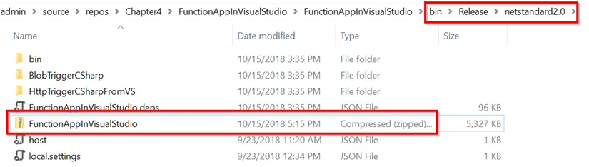 - Desplázate a la ubicación en la que se muestra la carpeta bin junto con otros archivos relacionados con tus funciones. Con estos archivos, crea un archivo .zip, que se resalta en la siguiente captura de pantalla: