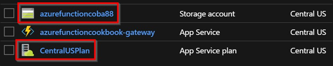 Como se muestra en la captura de pantalla anterior, la aplicación de función (en este caso azurefunctioncookbook-gateway) depende de un plan de App Service y una cuenta de almacenamiento: