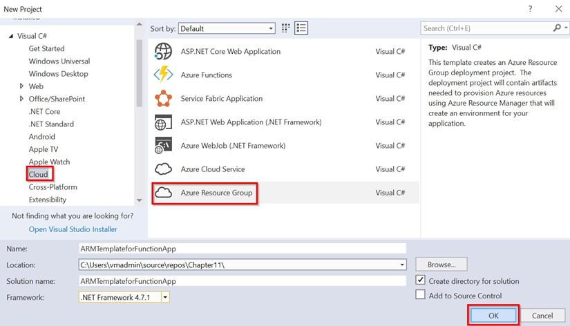 - Crea un proyecto nuevo seleccionando Visual C# | Cloud y, a continuación, elige Grupo de recursos de Azure: