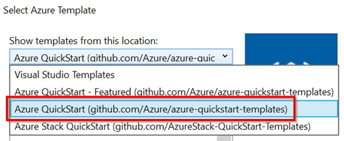 - Al hacer clic en el botón Aceptar en el paso anterior, se abrirá Seleccionar plantilla de Azure, donde selecciona las plantillas de inicio rápido de Azure (github.com/Azure/azure-quickstart-templates):