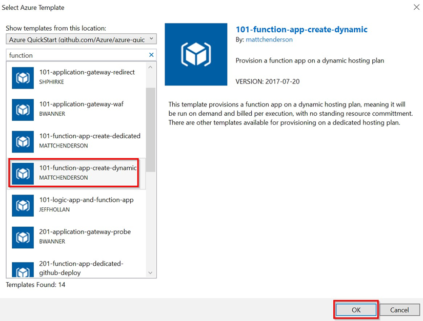 - Busca la palabra function y haz clic en la plantilla 101-function-app-createdynamic para crear la aplicación Azure Function con el plan de consumo: