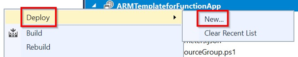 - Implementa el ARM para aprovisionar la aplicación de función y sus recursos dependientes. Puedes implementarlo haciendo clic con el botón derecho en el nombre del proyecto (en mi caso ARMTemplateforFunctionApp), haciendo clic en Implementar y, a continuación, haciendo clic en el botón Nuevo: