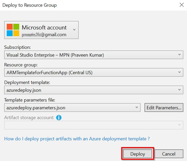 - Selecciona Suscripción, Grupo de recursos y otros parámetros para aprovisionar la aplicación de función. Selecciona todos los campos obligatorios y haz clic en el botón Implementar: