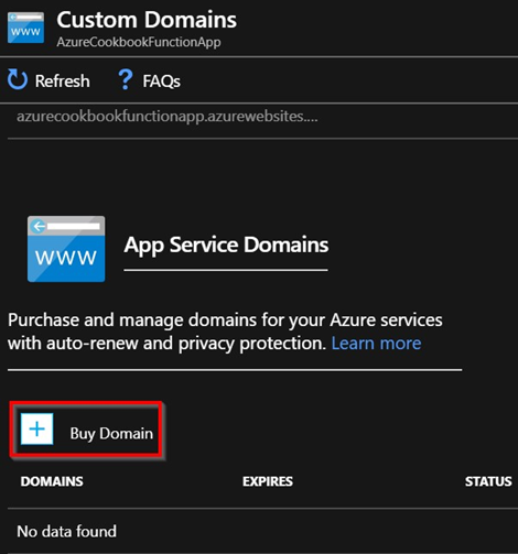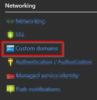 - Ve a la hoja Dominios personalizados de la aplicación Azure Function para la que deseas configurar un dominio: