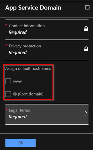 - Si has creado un dominio personalizado desde el portal de Azure, se te pedirá que elijas los nombres de host, como se muestra en la hoja Dominio de App Service: