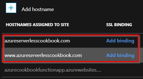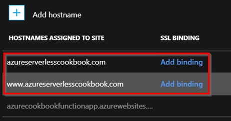 - Si has elegido ambas opciones, has terminado. Todo el trabajo en la integración de la aplicación de función y el dominio personalizado lo realiza el portal de administración de Azure. Aquí puedes ver la integración de los nombres de host: