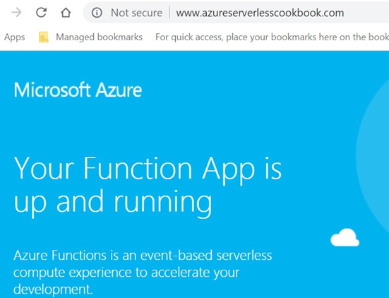 Eso es todo. Has integrado un dominio personalizado con la aplicación Azure Function. Ahora puedes explorar tu aplicación de función usando el nuevo dominio en lugar del predeterminado que Azure te brinda: