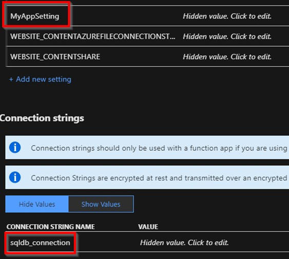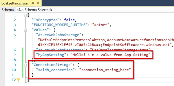 - Crea elementos de configuración con la clave MyAppSetting y ConnectionStrings con la clave sqldb_connection en el archivo local. settings.json. local.settings.json debe tener el aspecto que se muestra en la siguiente captura de pantalla: