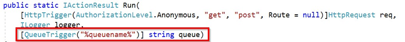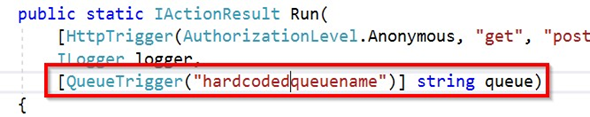 - El parámetro hardcodedqueuename es el nombre de la cola en la que se crearán los mensajes. Es obvio que codificar el nombre de la cola no es una buena práctica. Para poder configurarlo, debes utilizar la expresión de enlace de la configuración de la aplicación: