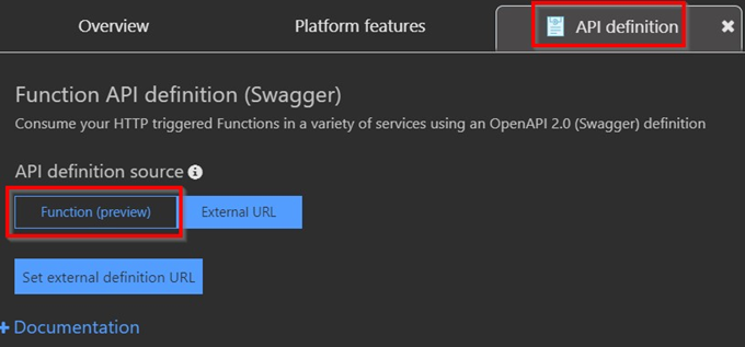 - En la pestaña Definición de API, haz clic en la opción Función (Preview) para activar el origen de la definición de la API: