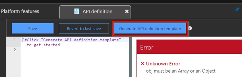 - En cuanto hagas clic en el botón Función (Preview), se activará la función. Sin embargo, es posible que veas un error en la nueva pestaña indicando que aún está abierta. No te preocupes, ya que la característica aún está en modo preview; Microsoft podría corregirla antes de que esté disponible con carácter general (GA). A continuación, haz clic en Generar plantilla de definición de API: