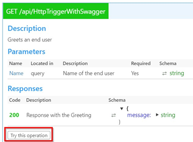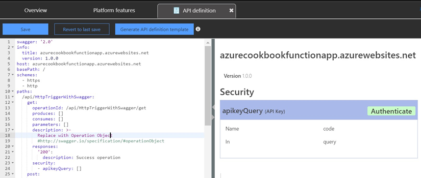 Ten en cuenta que en el momento de la escritura, la función de definición de la API solo es compatible con el runtime de Azure Function V1.0 y aún está en modo preview. Todavía no funciona con la V2.