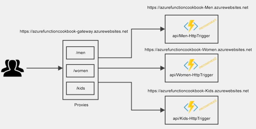 - Un componente de puerta de enlace (aplicación de función) que es responsable de controlar el tráfico al microservicio correcto en función de la ruta (/hombres, /mujeres y /niños). En esta aplicación de función, estaríamos creando proxies de Azure Function que redireccionarán el tráfico utilizando las configuraciones de ruta.