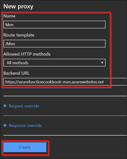 Nombre de proxy | Plantilla de ruta | Dirección URL de back-end (las direcciones URL de los desencadenadores de HTTP creados en el paso anterior) |