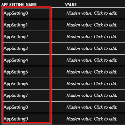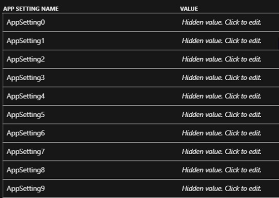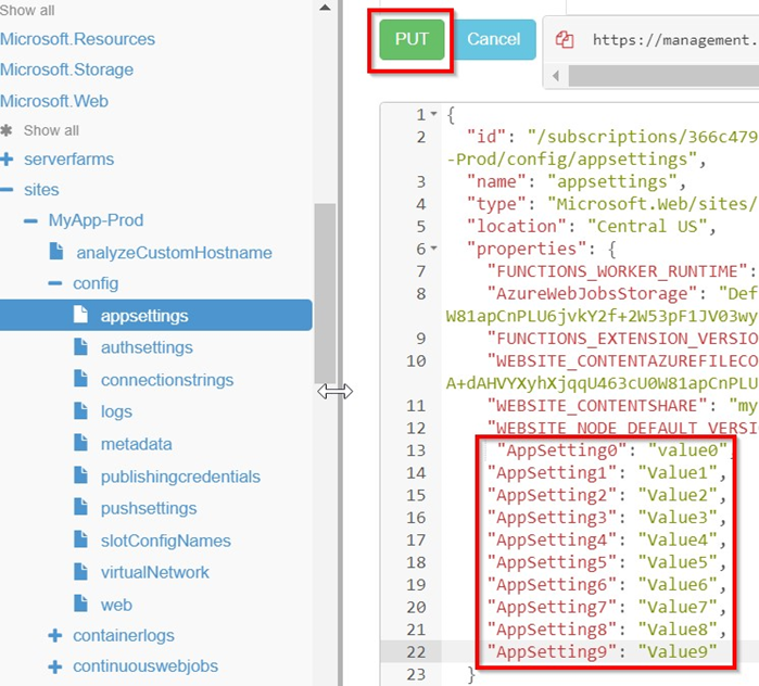 - Desplázate hasta la aplicación de función MyApp-Prod (cuyas configuraciones de la aplicación no aparecen resaltadas en la captura de pantalla anterior), haz clic en el Explorador de recursos y, a continuación, haz clic en los elementos config | appsettings para abrir las configuraciones de la aplicación existentes. Debería tener el siguiente aspecto: