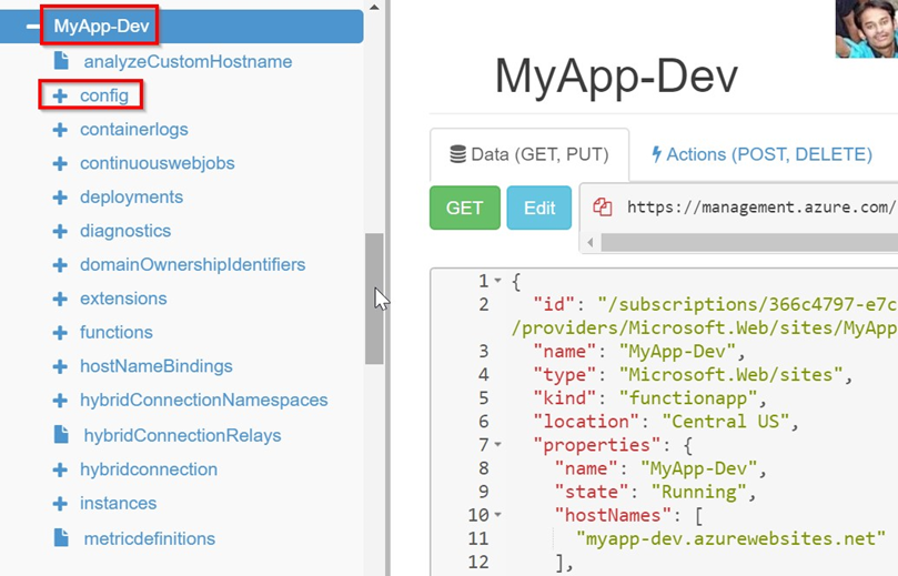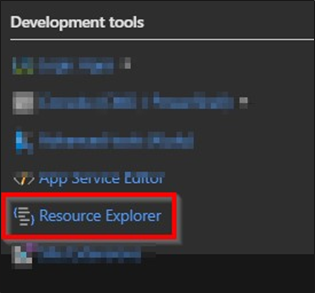 - Ve a la pestaña Características de la plataforma de la aplicación de función MyApp-Dev y haz clic en Explorador de recursos: