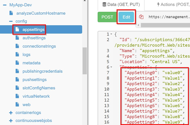 - El Explorador de recursos mostrará todas las configuraciones de la aplicación en la ventana de la derecha. Ahora, puedes editarlas haciendo clic en el botón Editar, que aparece resaltado en la captura de pantalla anterior, o puedes copiar todas las configuraciones de la aplicación de AppSetting0 a AppSetting 9.