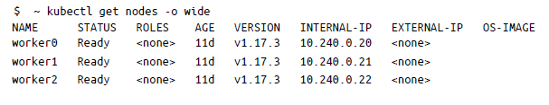 Esto enumerará los recursos del nodo y su estado, junto con la información de versión. Puedes obtener un poco más de información utilizando la marca -o wide en el comando get nodes de la manera siguiente:
