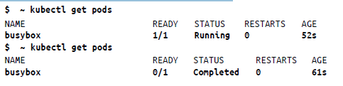Este comando te registrará directamente dentro del contenedor. Además, dado que ejecutas el pod en modo interactivo, puedes comprobar cómo cambia el estado de busybox de En ejecución a Completado, como a continuación: