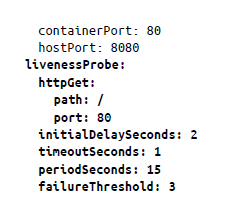 Sondeo de estado de vida. Este sondeo es responsable de garantizar que la aplicación se encuentre en buen estado y funcione correctamente. Después de la implementación, la aplicación puede tardar unos segundos antes de que esté lista, por lo que puede configurar este sondeo para comprobar un punto de conexión determinado en la aplicación. Por ejemplo, en el siguiente manifiesto de pod, se ha utilizado un sondeo de estado de vida para realizar una operación httpGet en la ruta / en el puerto 80. initialDelaySeconds se establece en 2, lo que significa que el punto de conexión / no se alcanzará hasta que haya transcurrido este período. Además, hemos establecido el tiempo de espera en 1 segundo y el umbral de error en 3 errores de sondeo consecutivos. periodSeconds se define como la frecuencia con la que Kubernetes llamará a los pods. En este caso, son 15 segundos.