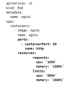 Puedes declarar dos parámetros en el manifiesto de pod: request y limit. En el bloque request le indicas a Kubernetes los requisitos de recursos mínimos para que funcione tu aplicación y en el bloque limit le indicas a Kubernetes el umbral máximo. Si tu aplicación incumple el umbral del bloque de límite, finalizará o se reiniciará y el pod normalmente se expulsará. Por ejemplo, en el siguiente manifiesto de pod, vamos a colocar un límite máximo de CPU de 500 m4 y un límite de memoria máximo de 206 Mi5, lo que significa que si se cruzan estos valores, el pod se expulsará y se reprogramará en algún otro nodo: