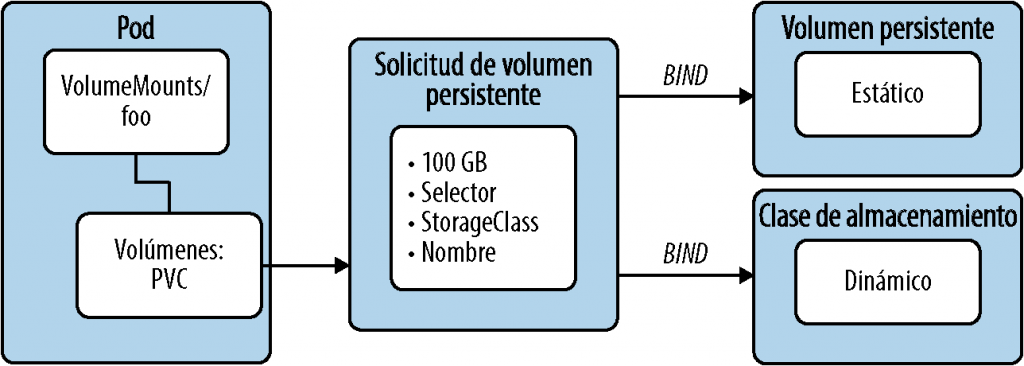 En la figura 4-3, se muestra la relación lógica entre los distintos objetos de almacenamiento que ofrece Kubernetes.