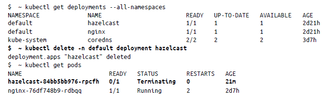 Por lo tanto, para eliminar un pod, habría que eliminar la implementación, con lo cual, a su vez, se eliminaría el pod automáticamente. Esto se muestra a continuación:
