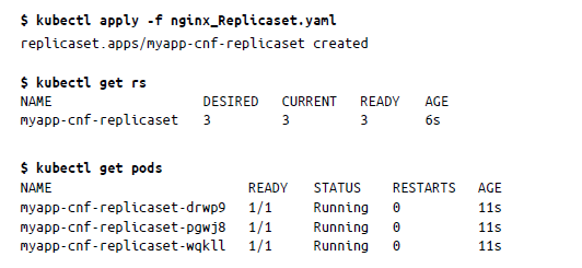 Para crear el ReplicaSet a partir de la configuración anterior, es preciso guardar el manifiesto como nginx_Replicaset.yaml y aplicarlo. Esto creará un ReplicaSet y tres pods, tal como se muestra a continuación: