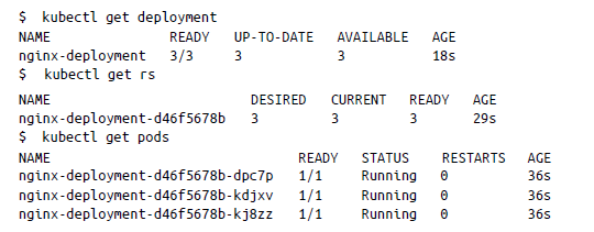 Curiosamente, la implementación también gestiona los ReplicaSets, ya que declaramos que necesitaríamos tres réplicas para el pod de implementación. Podemos comprobarlo de la siguiente manera: