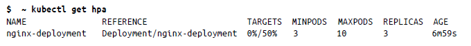 El comando kubectl anterior creará un HPA que garantizará que se utilicen no menos de tres y no más de 10 pods en nuestra nginx-deployment. El HPA aumentará o reducirá el número de réplicas para mantener un uso medio de la CPU en todos los pods de no más del 50 %.