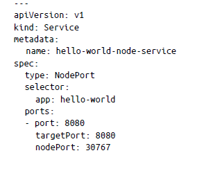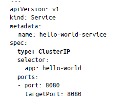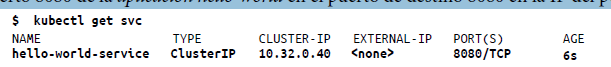 El port representa el puerto en el que el servicio estará disponible y el targetPort es el puerto del contenedor real en el que se reenviará el servicio. En este caso, hemos expuesto el puerto 8080 de la aplicación hello-world en el puerto de destino 8080 en la IP del pod: