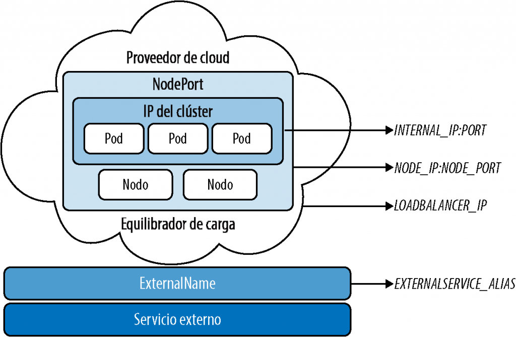Otros tipos de servicios incluyen LoadBalancer y ExternalName. LoadBalancer expone el servicio externamente utilizando el equilibrador de carga de un proveedor de cloud. Los servicios NodePort y ClusterIP, a los que se enruta el equilibrador de carga externo, se crean automáticamente, mientras que ExternalName asigna un servicio a un nombre DNS como my.redisdb.inter nal.com. En la Figura 4-6, puedes ver cómo están relacionados entre sí diferentes tipos de servicios.