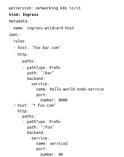 En el manifiesto de entrada, hemos creado dos reglas y hemos asignado foo.bar.com como host a un subdominio /bar, que se enruta a nuestro servicio anterior hello-world-node-service.