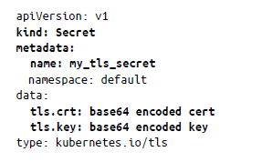 Puedes proteger la entrada especificando solo el certificado TLS codificado en Base64 y la clave. Cuando hagas referencia a este secreto en tu manifiesto de entrada, aparecerá de la siguiente manera: