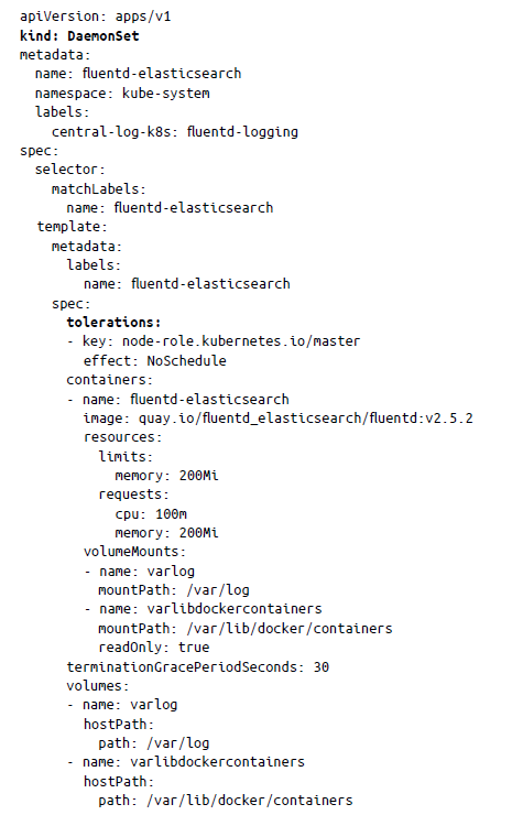 En la configuración de DaemonSet anterior, creamos un DaemonSet que implementará el contenedor Fluentd en cada nodo. También hemos creado una tolerancia, que no programa el nodo Fluentd en los nodos maestros (del plan de control).