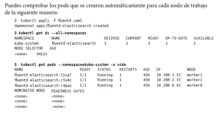 En entornos normales, ejecutamos una serie de servicios y agentes de demonio en el host, incluidos agentes de registro y agentes de supervisión. Kubernetes te permite instalar estos agentes ejecutando una copia de un pod en un conjunto de nodos de un clúster mediante DaemonSets. Al igual que los ReplicaSets, los DaemonSets son procesos de larga ejecución que garantizan que el estado deseado y el estado observado permanezcan iguales. Al eliminar un DaemonSet, también se eliminan los pods que este creó anteriormente.