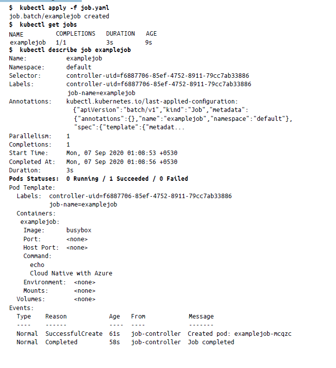 Aquí hemos creado un objeto Job para imprimir un comando de shell. Para crear un objeto Job, puedes guardar el archivo YAML anterior y aplicarlo usando kubectl apply. Una vez que apliques el manifiesto de trabajo, Kubernetes creará el trabajo y lo ejecutará inmediatamente. Puedes comprobar el estado del trabajo mediante kubectl describe de la manera siguiente: