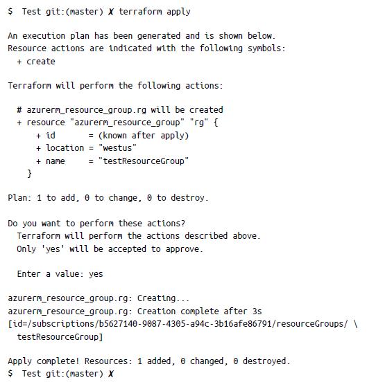 Como puedes ver en el resultado anterior, estamos intentando crear un grupo de recursos con el nombre testResourceGroup. Ahora puedes crear el recurso ejecutando terraform apply. Recuerda que debes escribir explícitamente yes para continuar: