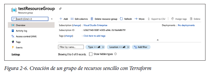 Esto debería crear un grupo de recursos, como se muestra en la figura 2-6. Puedes verificarlo en Azure Portal.