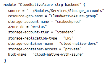 Ahora, sigue los pasos descritos en «Uso básico y configuración de la infraestructura con Terraform» de la página 20 para implementar la cuenta de almacenamiento. Cuando ejecutes el comando terraform plan, verás una gran cantidad de información sobre el plan entre los módulos. También observarás que los módulos (por ejemplo, Storage_accounts) se han abstraído, mientras que el archivo de recursos tiene el siguiente aspecto: