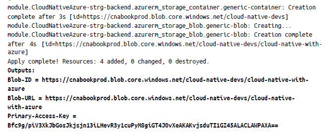 Esto demuestra el poder de abstraer la infraestructura repetible detrás de los módulos. Una vez que utilices terraform apply, al cabo de unos minutos verás una cuenta de almacenamiento denominada cnabookprod y un blob llamado cloud-native-with-azure:
