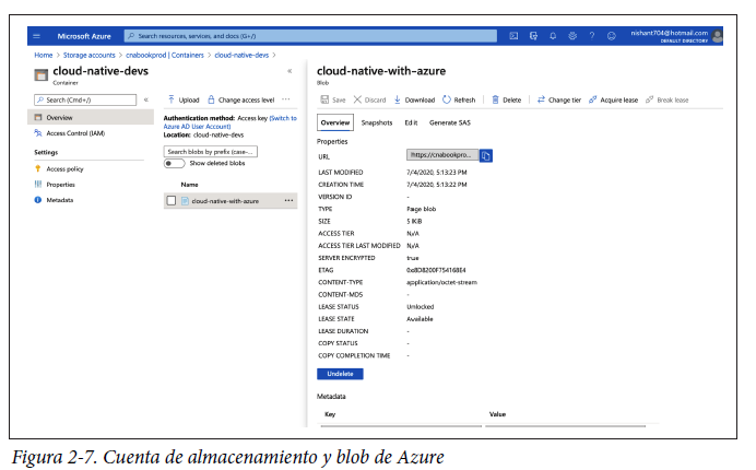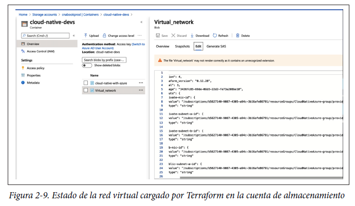 Como se muestra en la figura 2-9, Terraform ha almacenado el estado de la red virtual en la cuenta de almacenamiento de blobs que creamos anteriormente.