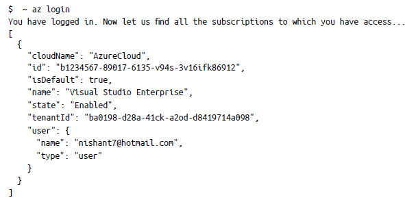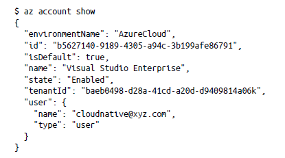 $ az account list –query «[].{name:name, subscriptionId:id, tenantId:tenantId}»