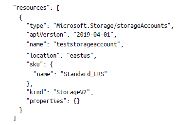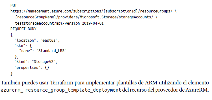 Antes de pasar al siguiente apartado, echemos un vistazo a lo que Azure ofrece de forma nativa para implementar la infraestructura como código. Como se ha señalado anteriormente, Azure utiliza plantillas de ARM para implementar la infraestructura como código para cargas de trabajo basadas en Azure. Las plantillas de ARM vienen en un archivo JSON5 que define la infraestructura y la configuración del proyecto. El archivo utiliza una sintaxis declarativa similar a Terraform, que te permite definir la configuración de la infraestructura deseada. Además de la sintaxis declarativa, las plantillas de ARM también heredan la idempotencia; es decir, puedes implementar la misma plantilla varias veces y obtener los mismos tipos de recursos en el mismo estado. El administrador de recursos es responsable de convertir la plantilla de ARM en una operación de API REST. Por ejemplo, si implementas la siguiente plantilla de ARM: