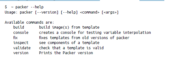 Para empezar a usar Packer, descarga el binario de Packer correspondiente a tu máquina local7. Descomprime el binario y muévelo a /usr/local/bin. Esto debería configurar Packer en tu equipo; puedes comprobarlo ejecutando packer –help en tu shell: