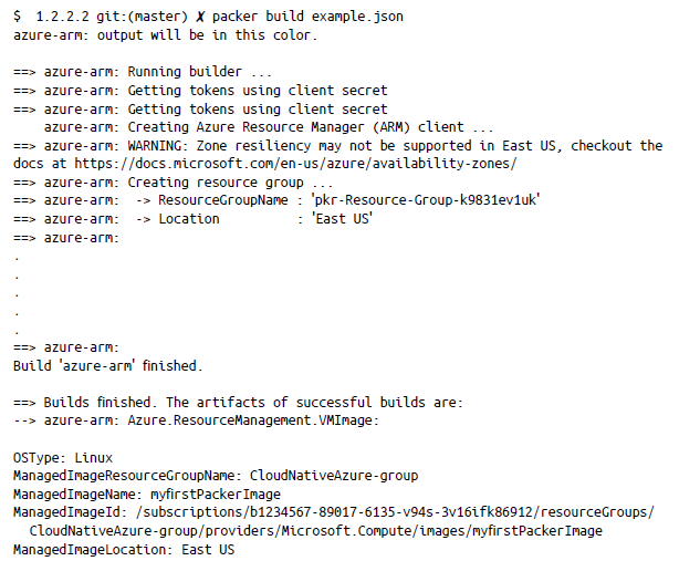 Puedes encontrar el código relacionado con la creación de imágenes de máquina de Packer en https://bit.ly/3GRgswf. Para ejecutar este código, primero debes actualizarlo con los detalles de autenticación del archivo example.json. Puedes utilizar los detalles de autenticación de tu cuenta de Azure del archivo bash_profile. El resultado de la ejecución debe parecerse al siguiente: