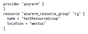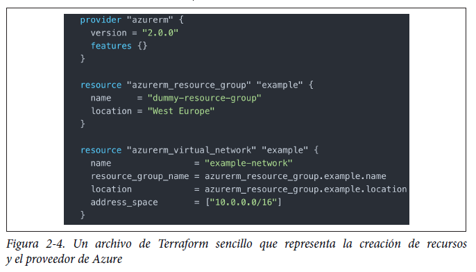 En la figura 2-4 se muestran los bloques provider y resource. El bloque provider indica la versión de Azure Resource Manager, mientras que los dos bloques resource crean el grupo de recursos de Azure y la red virtual.