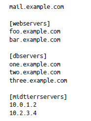 El archivo de inventario contiene la lista de todos los hosts que administra Ansible. El inventario suele contener direcciones IP, nombres de host, el nombre de usuario SSH y las claves para conectarse a la máquina remota. A continuación, se muestra un ejemplo del inventario: