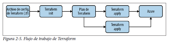 Ahora que hemos presentado los fundamentos de Terraform, veamos cómo funcionan juntos para aprovisionar infraestructura nativa en el cloud en Azure. En la figura 2-5 se ilustra el flujo de trabajo general.