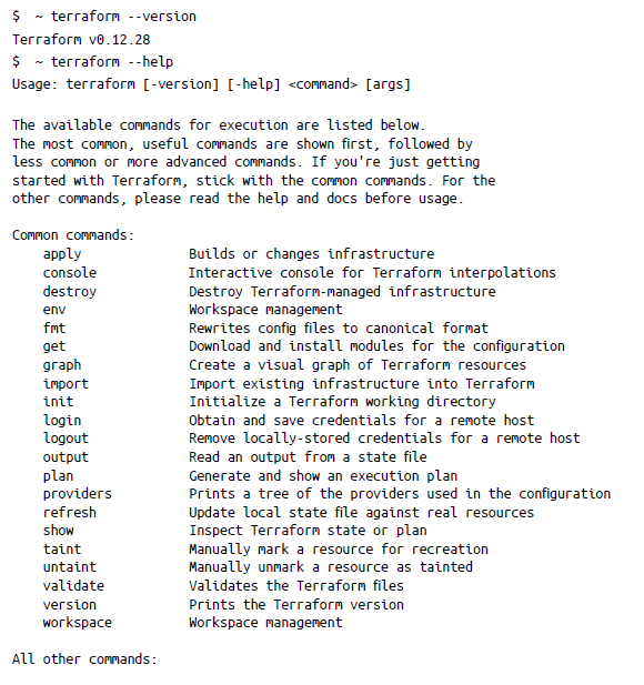 Cuando tengas el archivo ZIP, descomprime el binario y muévelo a /usr/local/bin. Puedes verificar que Terraform está instalado utilizando la ayuda de Terraform desde el shell: